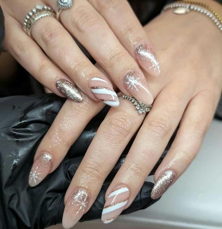 This set combines nude and soft blush tones with glittery champagne accents and delicate white starbursts. Curved stripes and subtle sparkles give it a festive but refined winter vibe.