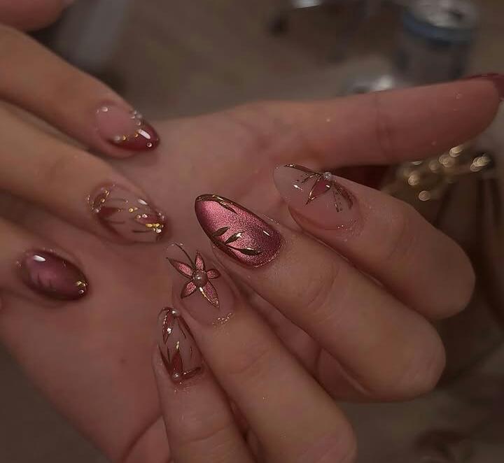Shimmery rose-gold nails are paired with translucent nude bases featuring gold-lined floral accents. The look is soft, feminine, and slightly festive, with a warm winter glow.