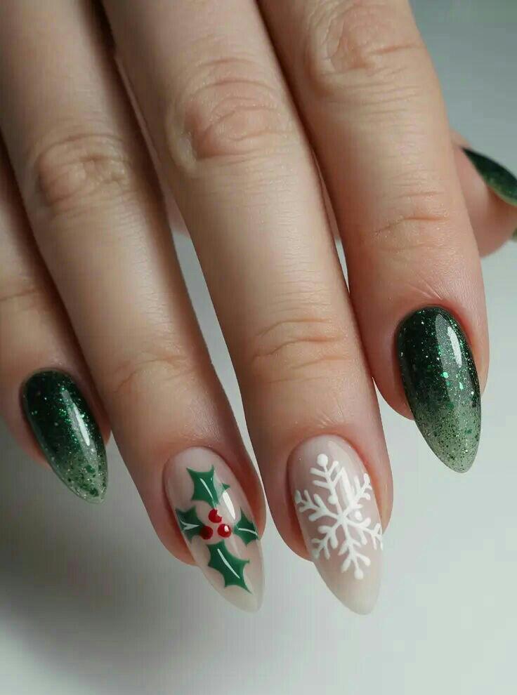 This look blends deep green glitter nails with two soft nude accents featuring a holly sprig and a white snowflake. It feels festive but still elegant, combining classic holiday symbols with a classy color palette.