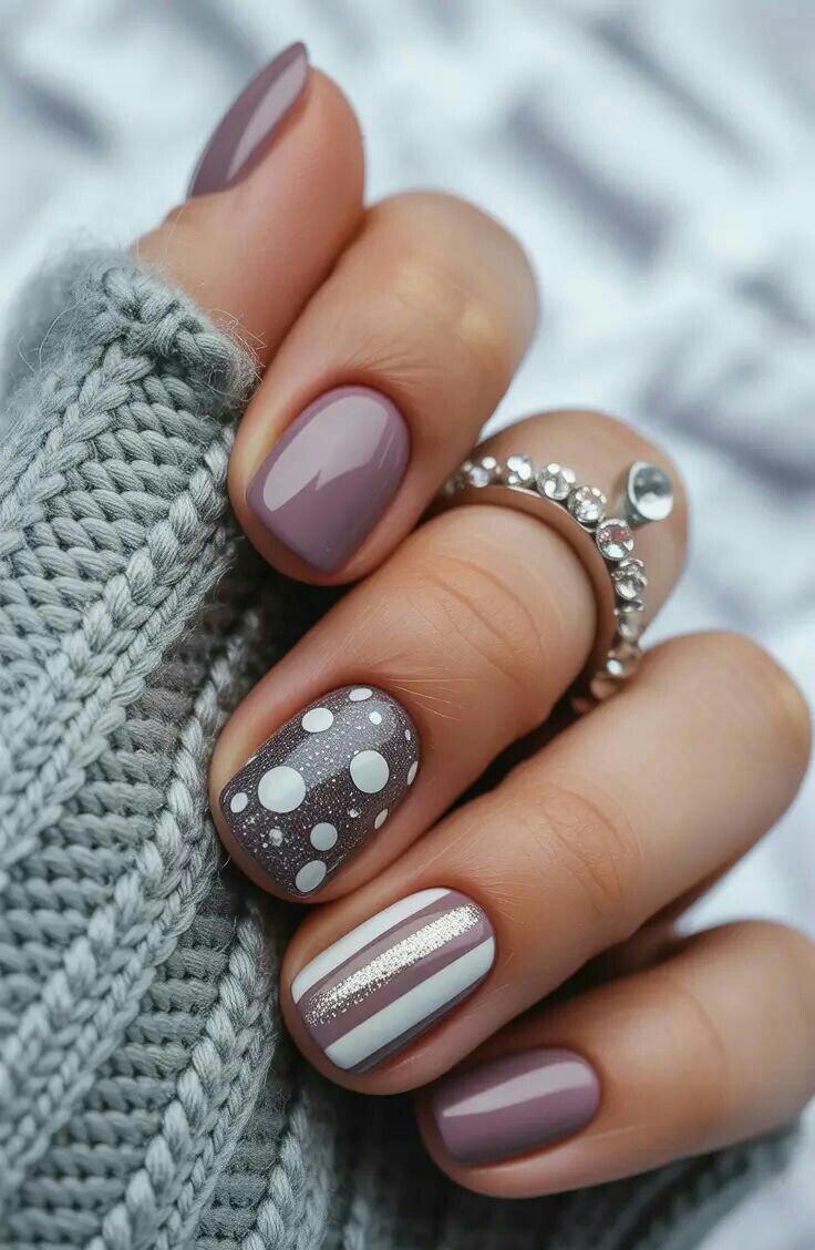 A muted mauve base pairs with playful dotted accents and chic vertical stripes in white and silver. The mix of soft winter tones and simple patterns gives it a cozy, stylish winter vibe.