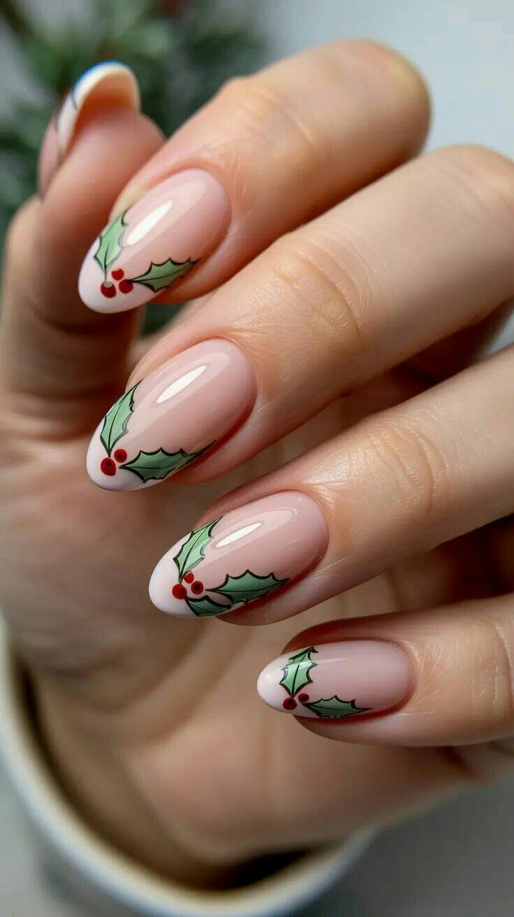 This set uses a natural nude base decorated with small holly leaves and red berries. The overall look is simple, festive, and elegant with a soft holiday feel.
