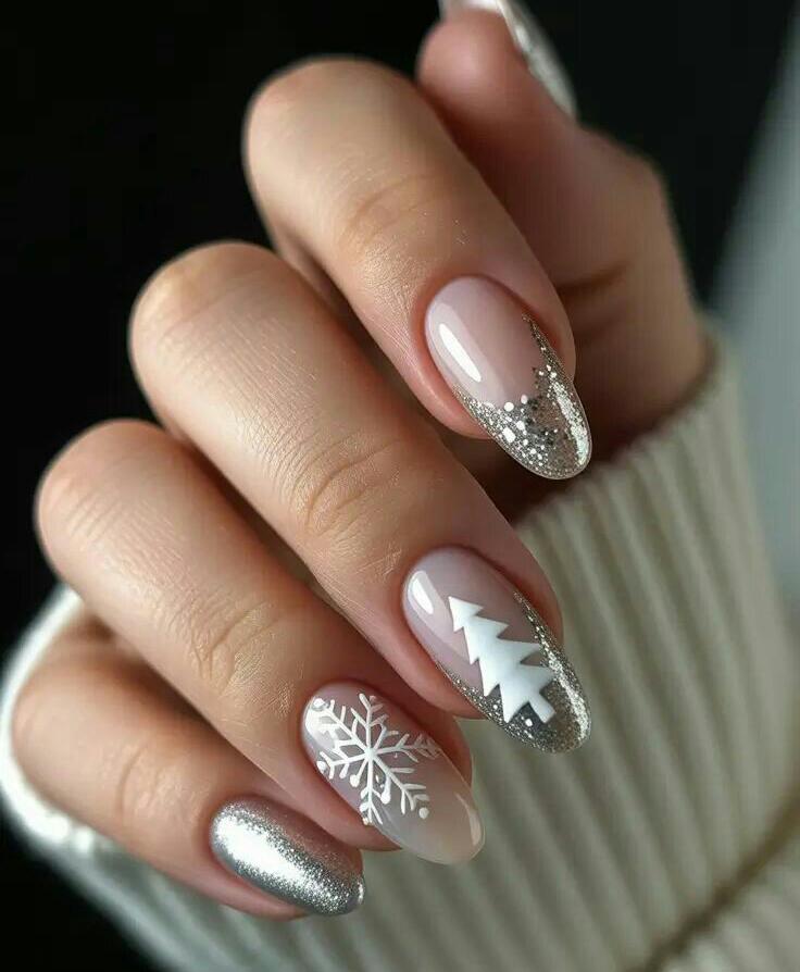 Shimmery silver tips and metallic accents pair with delicate white snowflakes and minimalist tree shapes over a nude base. The mix of sparkle and soft winter motifs creates a classy, wintry aesthetic.