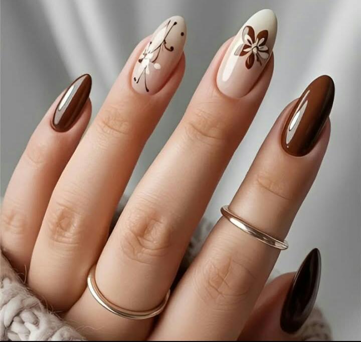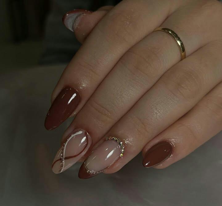 This design blends deep mocha tones with soft nude accents, giving a warm and sophisticated winter look. The mix of glossy solids, marbled swirls, and a touch of gold detailing adds subtle glamour without being overpowering.