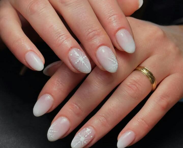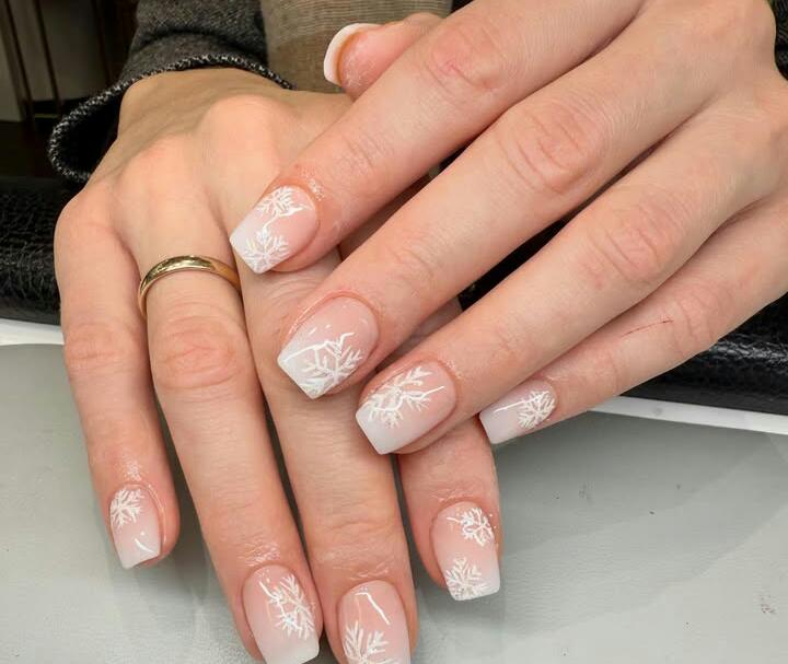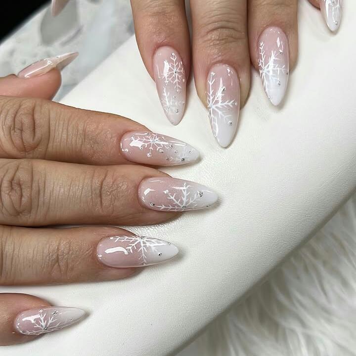 These nails feature a soft white ombré that feels light, clean, and wintry. Delicate snowflake line art adds a festive, frosted touch while keeping the overall look simple and classy.