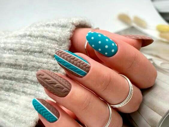 A playful mix of sweater-texture nails and bright teal accents creates a cute, cozy winter vibe. The combination of cable-knit patterns and polka dots makes it fun yet still stylish for colder seasons.