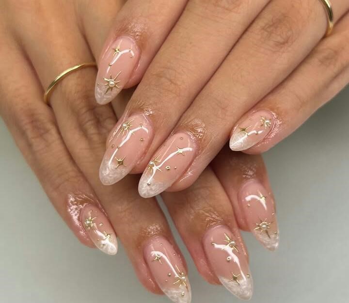 This design pairs natural pink tones with frosty white tips for a fresh, soft look. Tiny golden star accents scatter across the nails, giving them a dreamy, delicate winter sparkle.