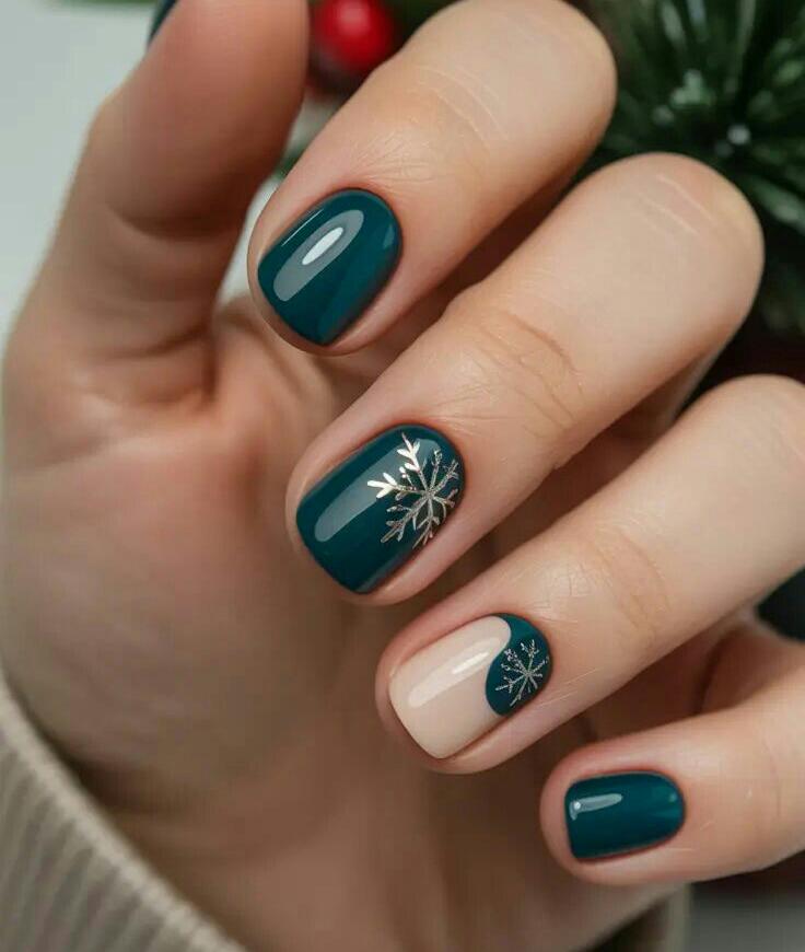 Rich emerald green nails are paired with a soft nude accent for a bold yet classy contrast. The metallic snowflake detailing adds a subtle festive edge while still looking polished and minimal.