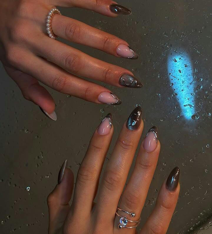 This set mixes a smoky chrome effect with a nude base for a bold yet polished finish. The metallic shine gives a cool winter vibe while still feeling elegant and trendy.