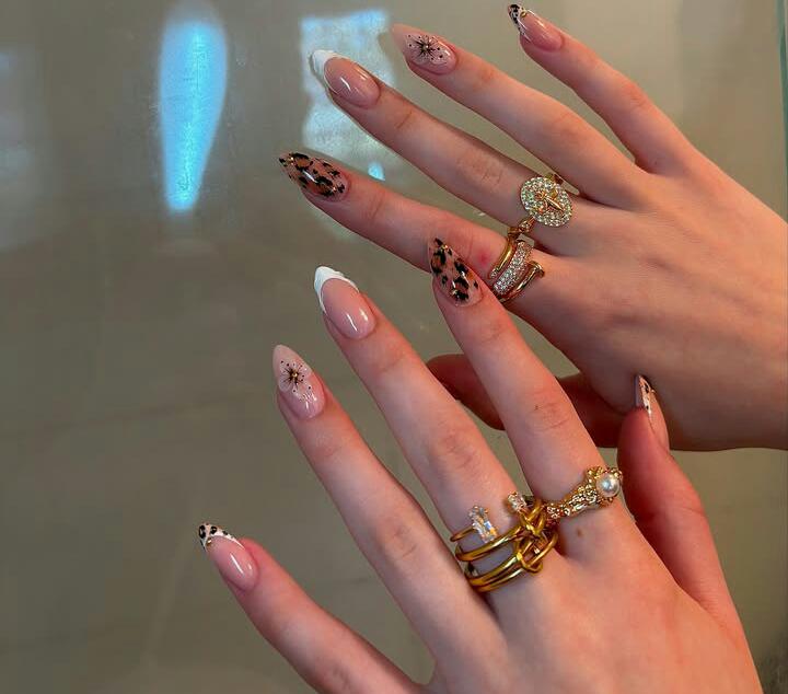 These nails mix soft nude polish with bold leopard-print accents and a touch of white French detailing. The combination gives a playful but still polished winter look.