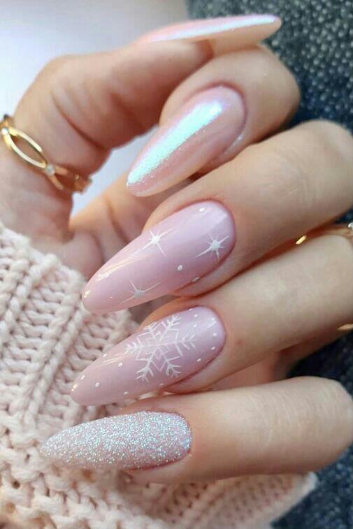 Light pink nails with shimmering finishes and fine white snowflake detailing create a soft, cozy winter look. The mix of sparkle and minimal art keeps things polished and feminine.