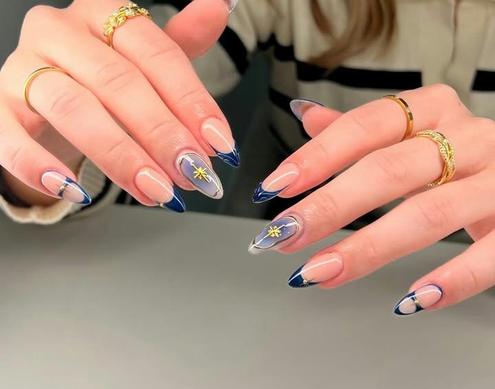These nails feature a sleek winter look with deep navy tips paired against a soft, natural base. Subtle celestial accents and minimal line work give the design a classy, modern vibe while still feeling seasonal and elegant.