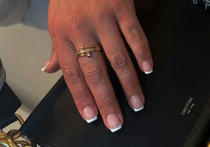 A simple and elegant French manicure with crisp white tips on a natural base. It’s minimal, classy, and perfect for a subtle winter look.