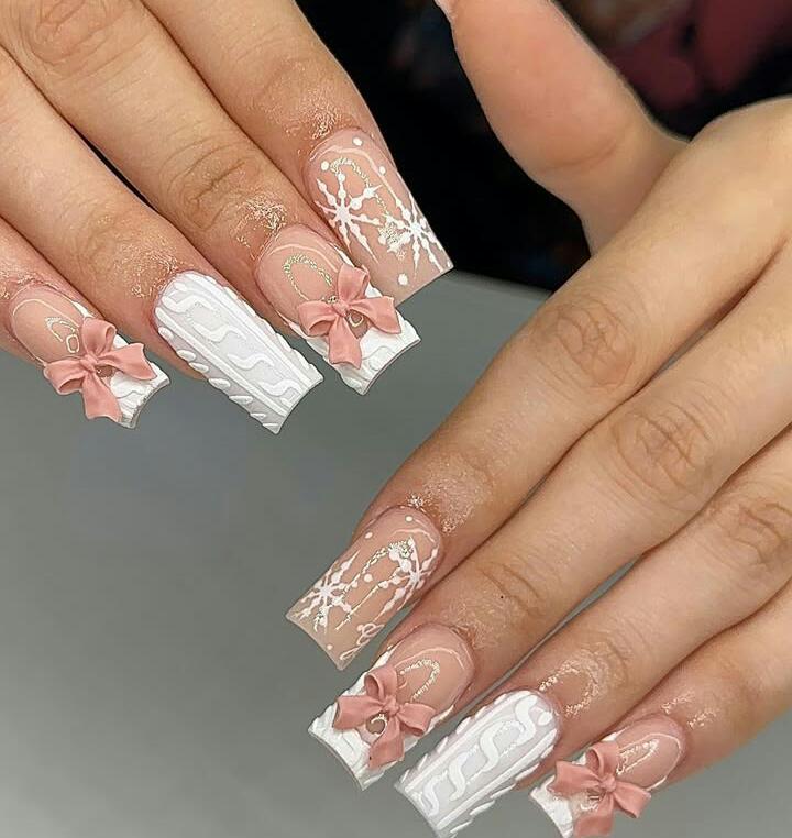 These nails combine soft pink tones with white sweater-knit patterns and 3D bows. The mix creates a warm, wintery, gift-wrapped aesthetic.
