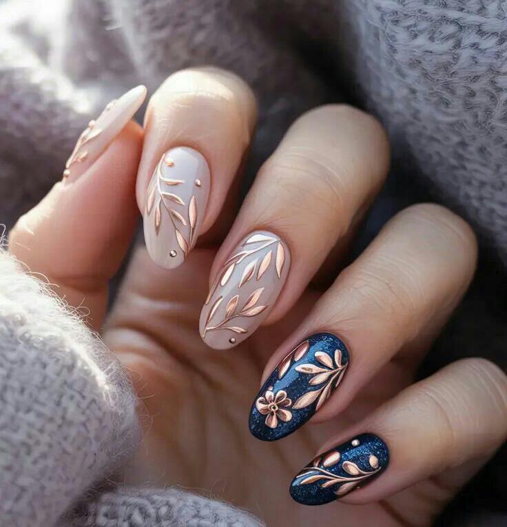 Matte neutral and deep blue nails are paired with raised metallic leaf patterns. The design feels sophisticated and slightly festive, with a calm winter elegance.
