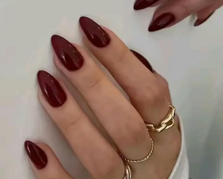 This design features glossy, deep wine-red nails shaped into a sleek almond style. The look is minimal, rich, and classy — perfect for a polished winter vibe.