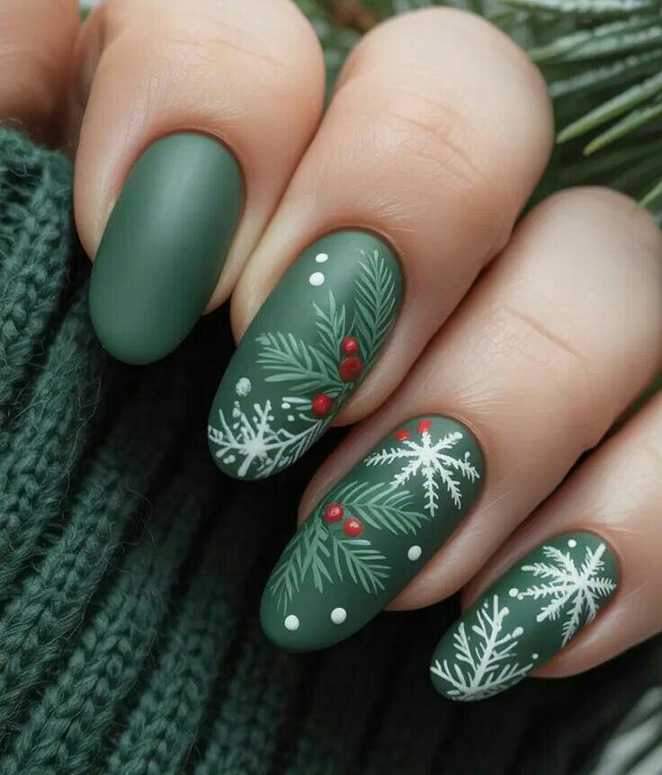 These matte forest-green nails showcase delicate pine branches, berries, and snowflakes. The design feels festive and cozy, with a soft winter-holiday charm.