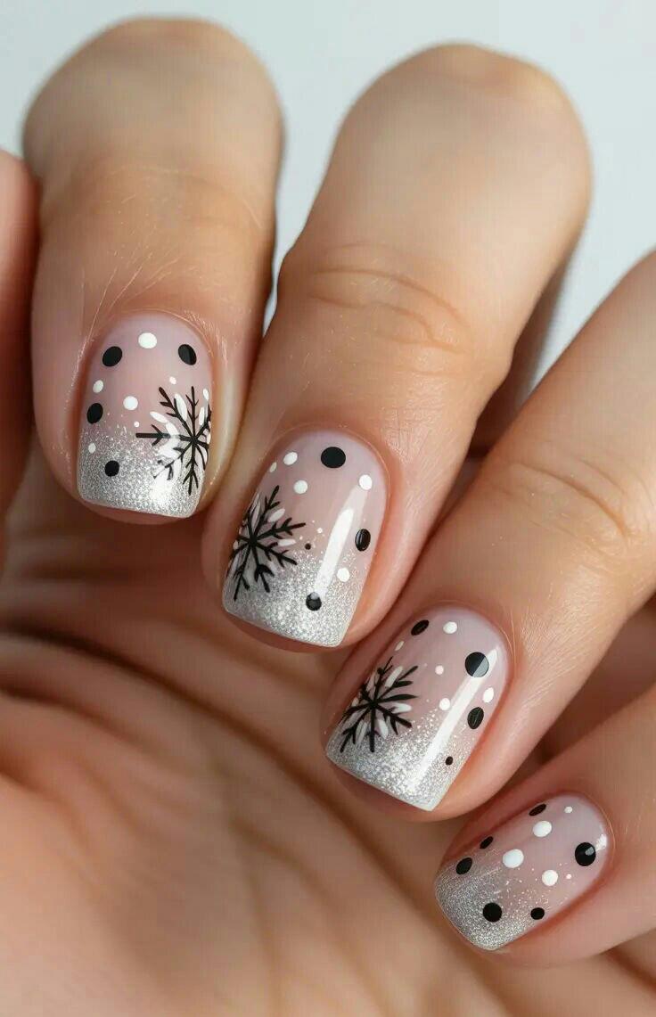 A soft nude base is paired with silver-glitter tips and scattered black-and-white dots. Snowflake accents add a clean, wintry touch without being overly detailed.