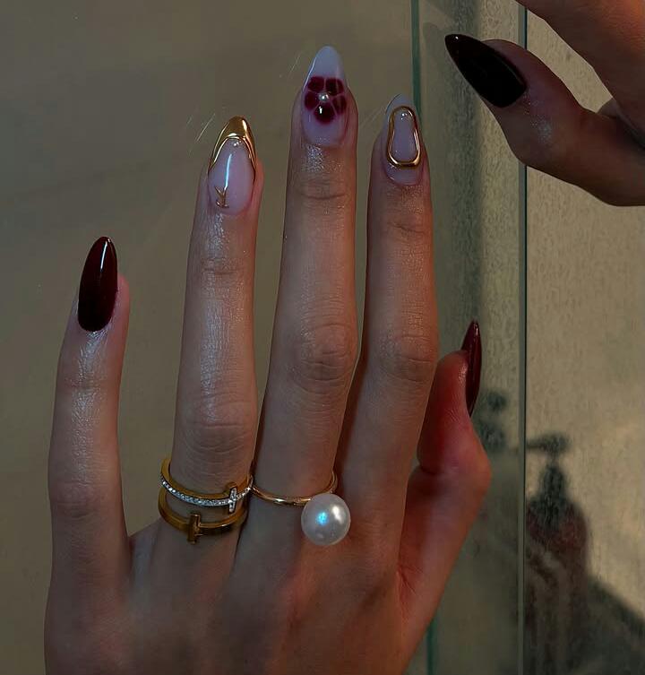 Deep burgundy tones blend with glossy neutrals and metallic gold outlines for a bold winter aesthetic. The mix of dark color and molten gold accents gives it a rich, modern feel.