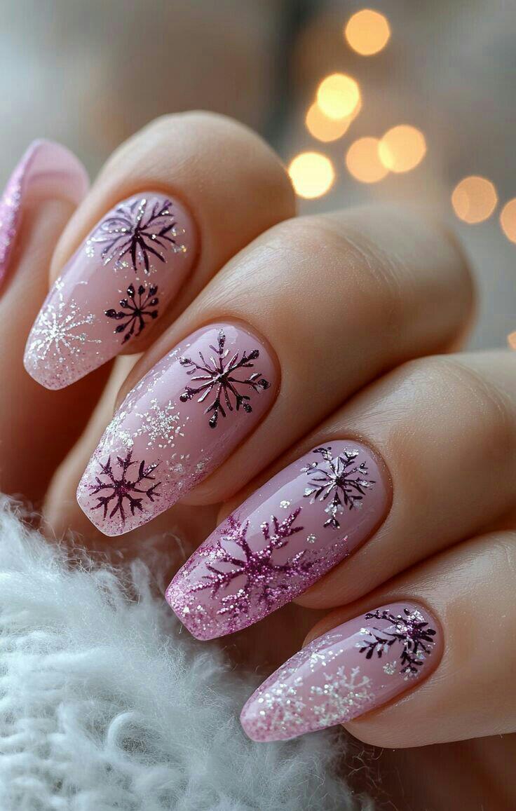 A sheer pink base is topped with shimmering snowflakes and glittery pink gradients at the tips. The look is feminine, frosty, and eye-catching with a glamorous winter glow.