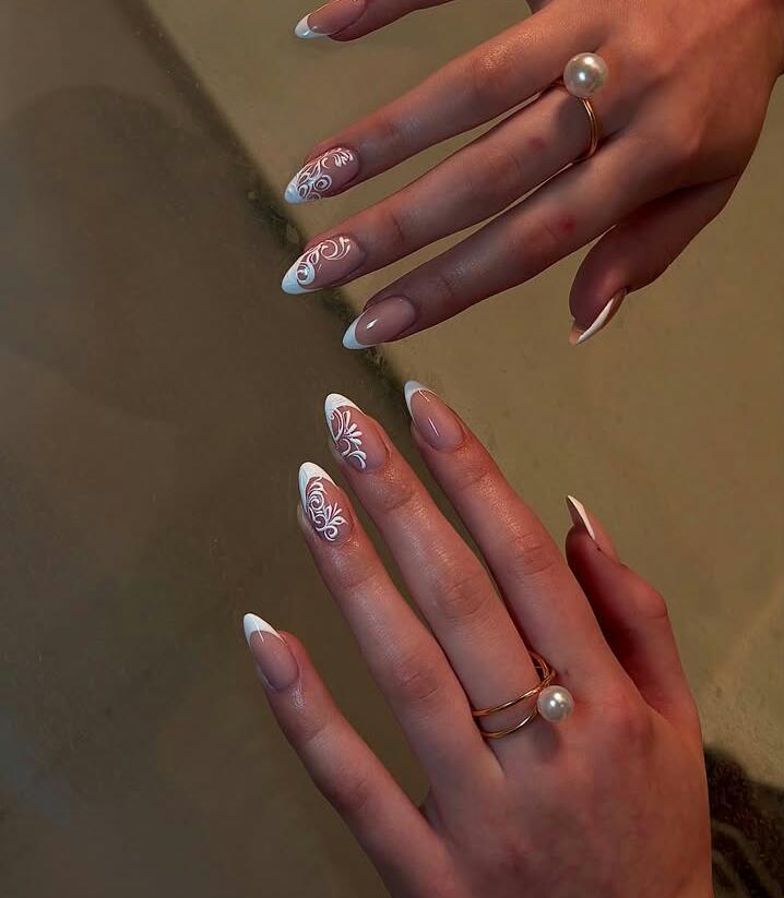 This design features soft nude nails with crisp white tips, accented by delicate swirl patterns that add a classy, romantic touch. The look is clean, feminine, and perfectly suited for a simple winter-chic vibe.