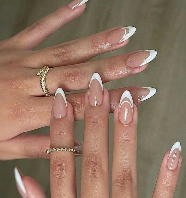 This design features soft almond-shaped nails with a modern French tip, using crisp white edges over a sheer nude base. The look is clean, minimal, and classy — perfect for a chic winter aesthetic.