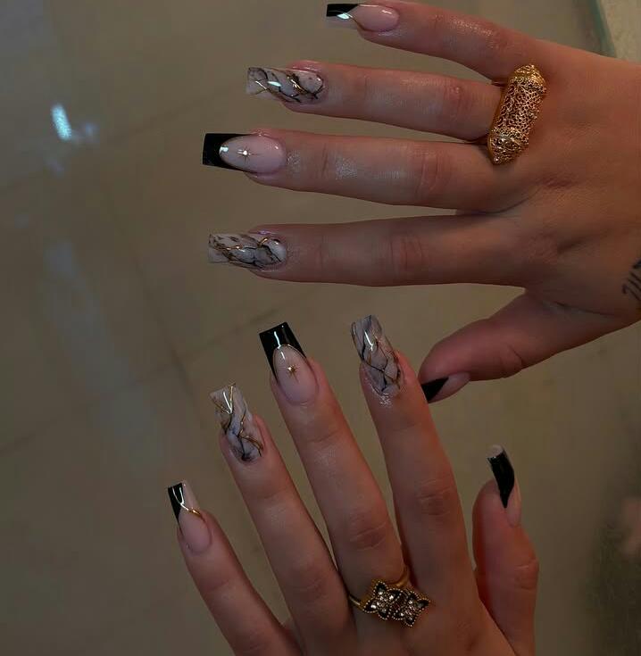 These square nails combine glossy black French tips with soft marble accents in neutral tones. The gold lines add a subtle hint of luxury, giving the whole design a stylish winter sophistication.