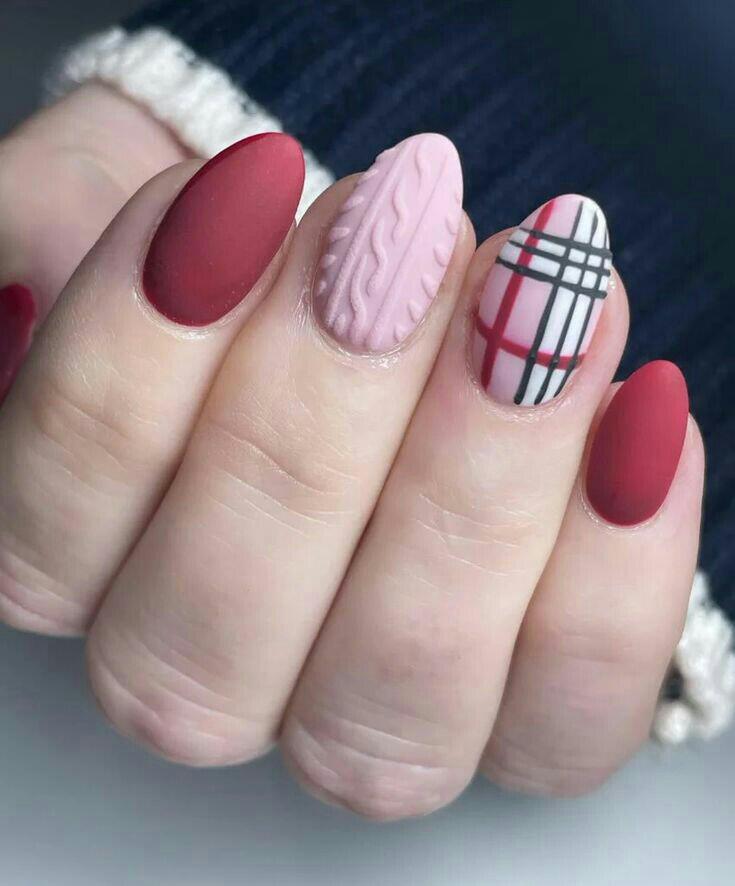 These matte nails blend warm winter red with a knitted-texture accent nail and a plaid pattern. The combination feels cozy and festive — perfect for cold-weather style.