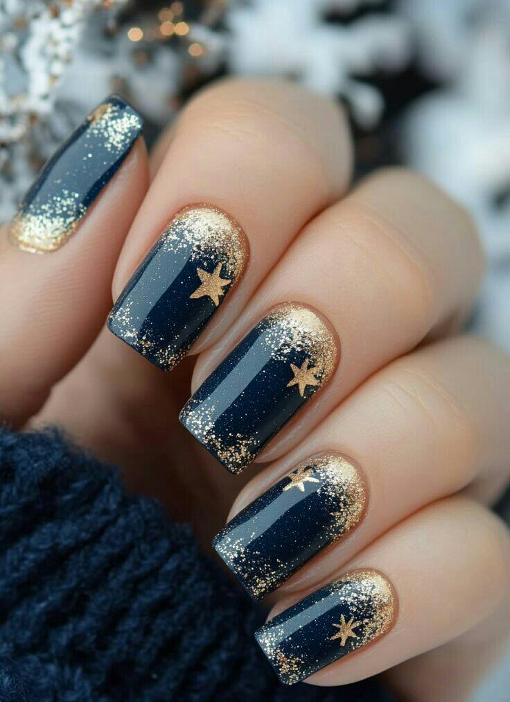 These nails pair a deep navy base with golden glitter gradients and star accents for a magical, winter-night look. It’s glamorous, festive, and perfect for a classy seasonal manicure.
