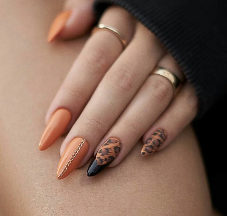 Warm caramel tones paired with sharp almond-shaped tips give these nails a bold yet stylish feel. The leopard-print accents and tiny chain detail add a chic, fashion-forward edge that still feels classy for winter.