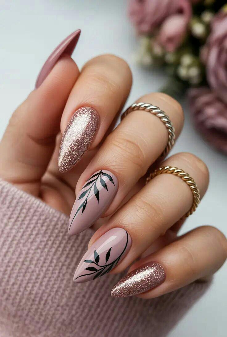 Soft mauve pink nails blend beautifully with rose-gold glitter accents for a feminine winter look. The black leafy detailing adds a modern, minimal-art twist that keeps the design polished and refined.
