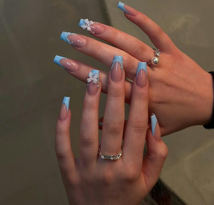 These nails combine a sheer base with frosty baby-blue French tips for a crisp, wintery look. The 3D bows and subtle line details make the design playful yet still sophisticated.