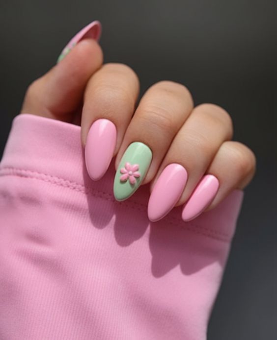 Soft pink nails are paired with colorful pastel flowers for a sweet spring-inspired look. It feels light, feminine, and effortlessly festive for Easter.