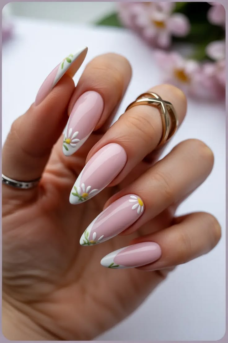 Glossy pale pink nails are finished with soft white French tips and small daisy accents. This design feels elegant, simple, and perfectly suited for a fresh spring celebration.
