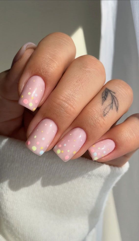 A sheer blush pink base is topped with tiny pastel dots for a fun, confetti-like effect. The overall look is simple, cheerful, and perfect for a subtle Easter touch.