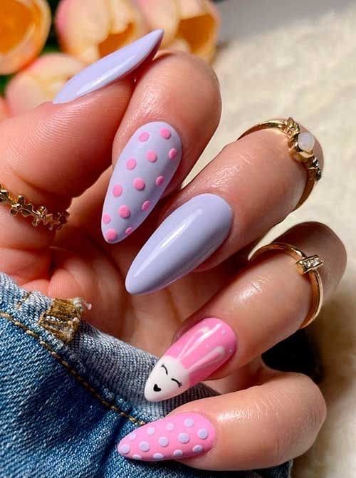 Glossy lavender and pink nails are paired with raised polka dots and a cute bunny accent. The mix of soft colors and 3D details makes the design playful and festive.