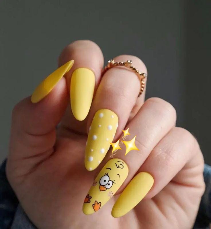 Pink and yellow pastel nails are combined with a cute chick accent and soft polka dots. The overall style is cheerful, playful, and perfect for Easter celebrations.