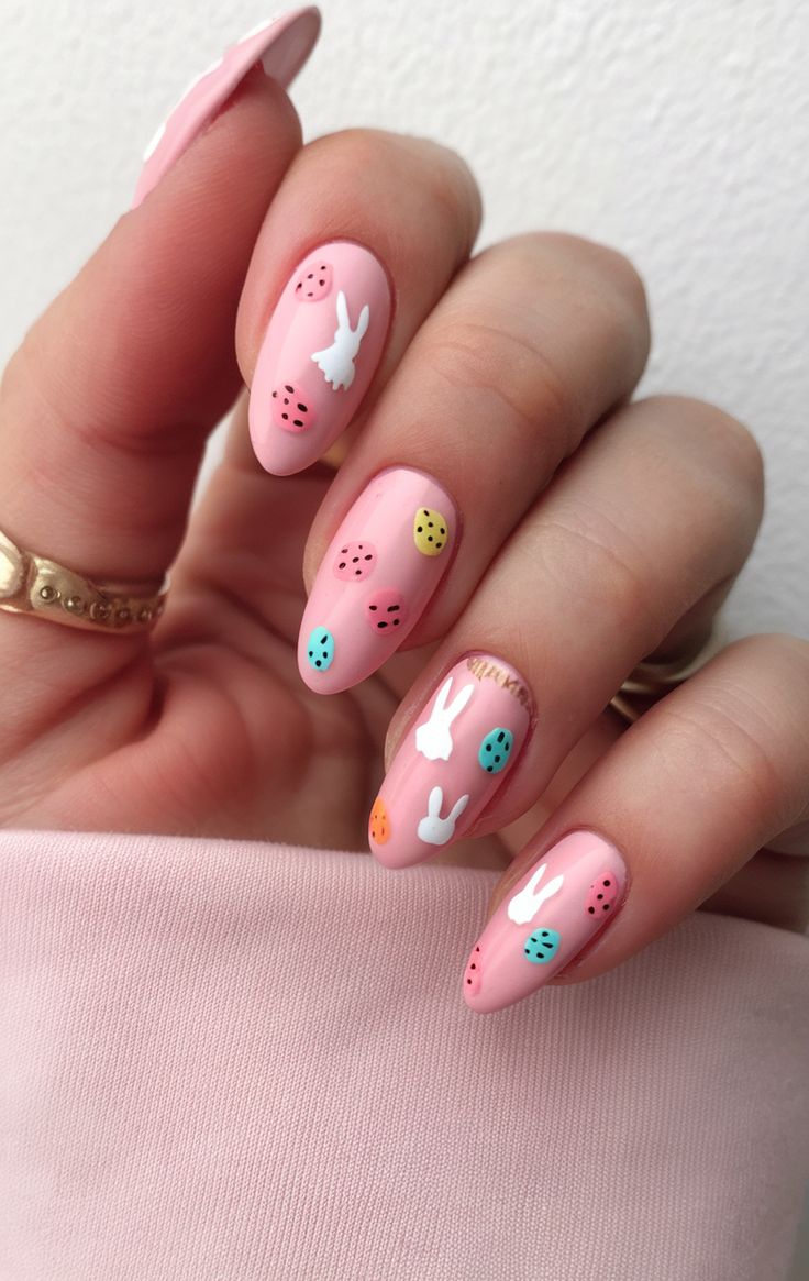 Soft pink nails with tiny white bunny faces and colorful dotted accents create a sweet, playful Easter look. The glossy finish and delicate details give it a light, cheerful spring vibe.
