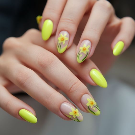Vibrant neon yellow nails are balanced with clear nude accents featuring hand-painted daffodil flowers. The overall style is fresh, floral, and perfect for welcoming spring.
