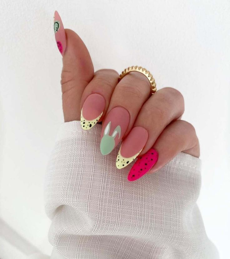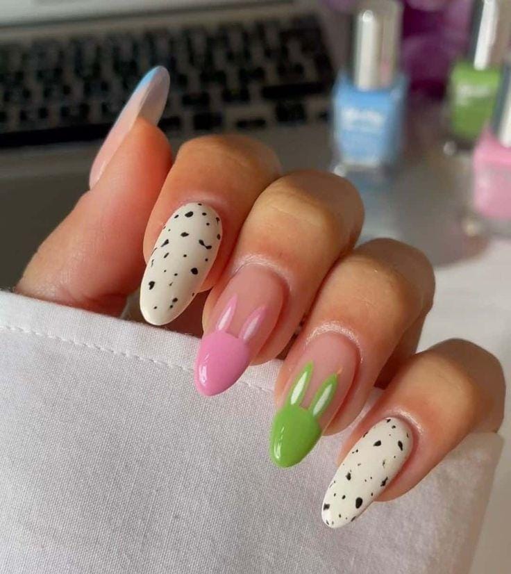 Muted pink nails are paired with pastel French tips, black speckles, and a simple bunny silhouette accent. The mix of soft tones and playful patterns gives it a modern yet festive Easter feel.