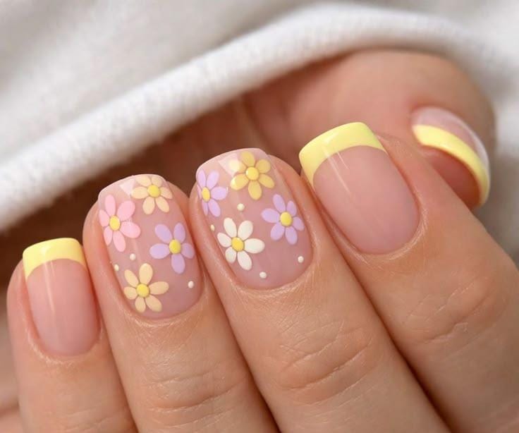 Muted pastel nails in yellow, pink, peach, and lilac feature simple flower accents. The design feels cheerful, clean, and inspired by sunny spring days.