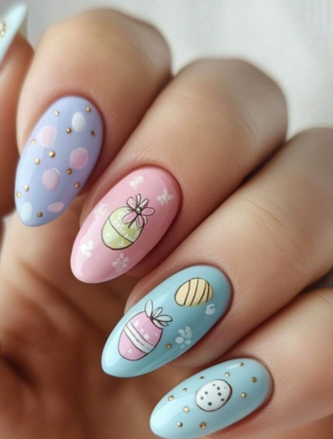 Almond-shaped nails feature soft pastel shades with cute Easter egg designs and delicate gold accents. The overall style is playful yet polished with a sweet seasonal charm.
