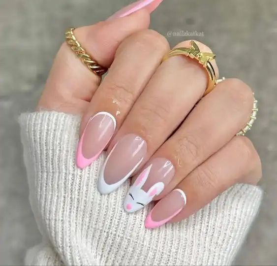 A soft nude base with pink and white French tips is elevated by a delicate bunny accent nail. The design is subtle, classy, and adds a gentle Easter touch.