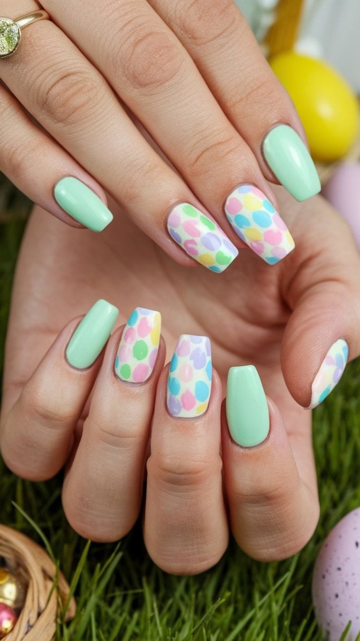 Mint green nails are complemented by pastel speckled egg-inspired accents for a classic Easter feel. The design is simple, soft, and playfully seasonal.