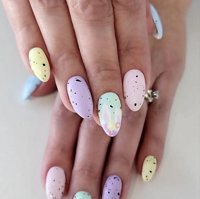 Soft pastel shades like lavender, mint, yellow, and blush are paired with subtle black speckles for a sweet speckled-egg effect. The overall vibe is light, playful, and perfect for a simple Easter look.