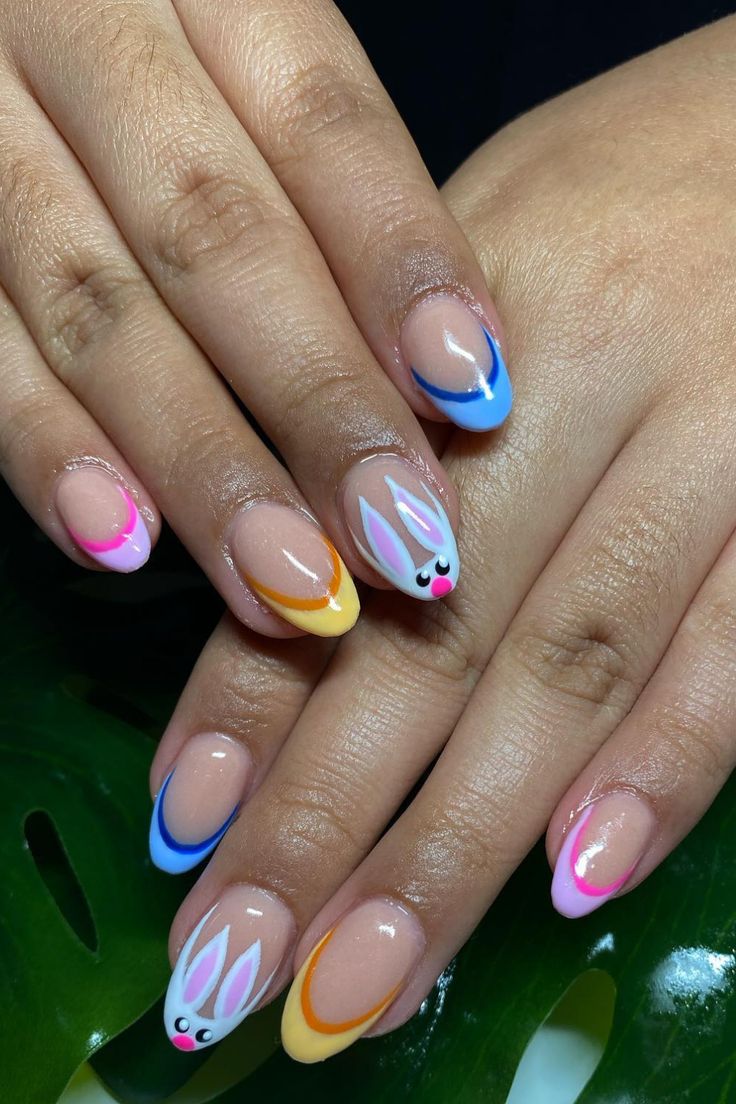 Neutral nails are brightened with colorful pastel French tips and adorable bunny accents. The mix of blue, yellow, and pink gives it a fun yet easygoing spring feel.