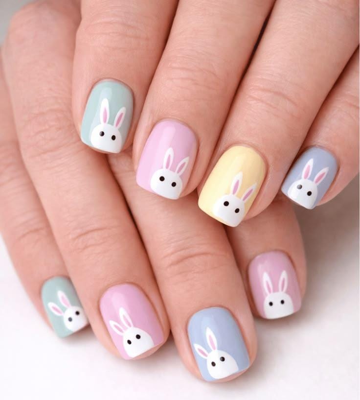 Soft pastel shades like mint, baby pink, yellow, and blue create a sweet spring palette. Tiny white bunny faces add a cute and playful Easter touch.