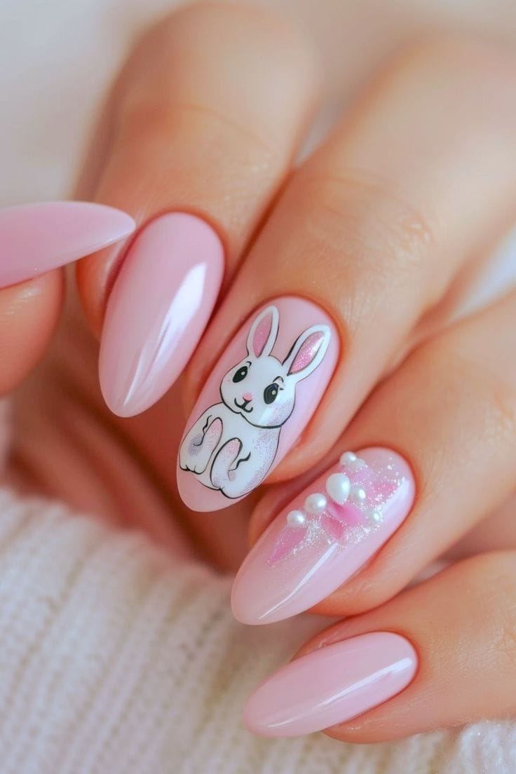 A soft blush pink base keeps the look elegant and simple. A detailed bunny accent nail with subtle shimmer adds a charming and whimsical Easter finish.