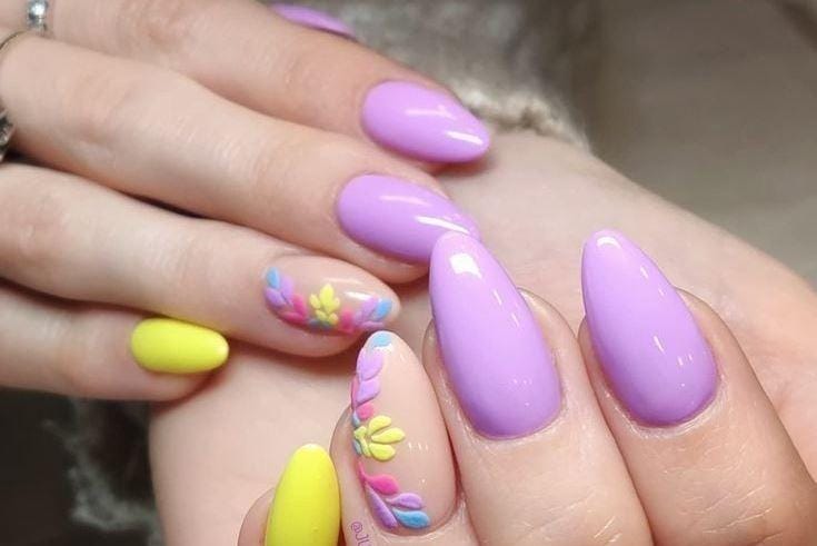 Bright lavender and yellow nails are combined with a floral accent design for a fresh spring statement. The smooth, glossy finish and bold pastel colors make it vibrant yet still soft enough for Easter.