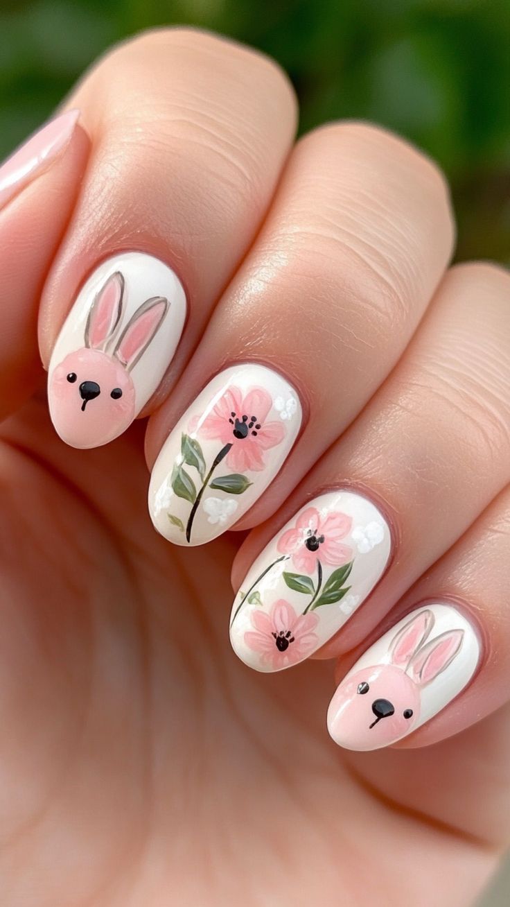 Soft white and blush pink nails feature tiny hand-painted flowers and adorable 3D bunny accents. The overall look is sweet, delicate, and perfect for a playful Easter vibe.