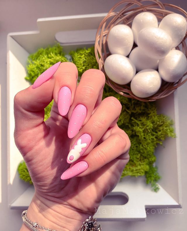 Matte pink and lavender nails are paired with simple white bunny ear accents and delicate polka dots. The look feels minimal, soft, and perfectly festive for Easter.